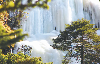 在著名的三疊泉瀑布前,原本飛流直下三千尺的壯觀場面不見了,呈現(xiàn)在游客眼前的是一條巨大的玉帶倒掛在崖壁上。險(xiǎn)峻的石巖上,已是懸崖百丈冰,不少參差不齊的冰凌懸掛在石巖上,往日桀驁不馴的瀑布此時(shí)變得溫馴了。整個(gè)山澗白茫茫一片,被晶瑩剔透的冰柱所覆蓋,銀裝素裹,氣勢恢宏,場面極為壯觀。此時(shí)雖聽不到往昔轟隆隆的瀑布聲,但能一睹這懸掛在石崖上的冰瀑,卻是別有一番景致。