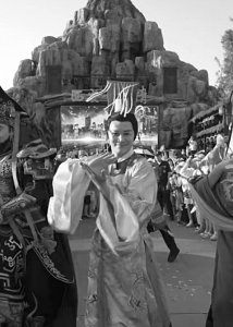 49歲的知名演員鄭國霖身著明黃龍袍、金冠束發(fā)、嘴叼玫瑰,騎著摩托車載著另一位扮演“秦始皇”的演員呼嘯而過。兩位“千古一帝”的魔性互動(dòng)引得現(xiàn)場(chǎng)游客陣陣歡呼。這并非影視劇拍攝現(xiàn)場(chǎng),而是上海千古情景區(qū)的日常一景。