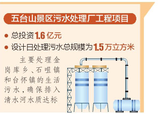 五臺山景區(qū)污水處理廠工程項(xiàng)目總投資1.6億元,設(shè)計日處理污水總規(guī)模為1.5萬立方米,主要處理金崗庫鄉(xiāng)、石咀鎮(zhèn)和臺懷鎮(zhèn)的生活污水,確保排入清水河水質(zhì)達(dá)標(biāo)。