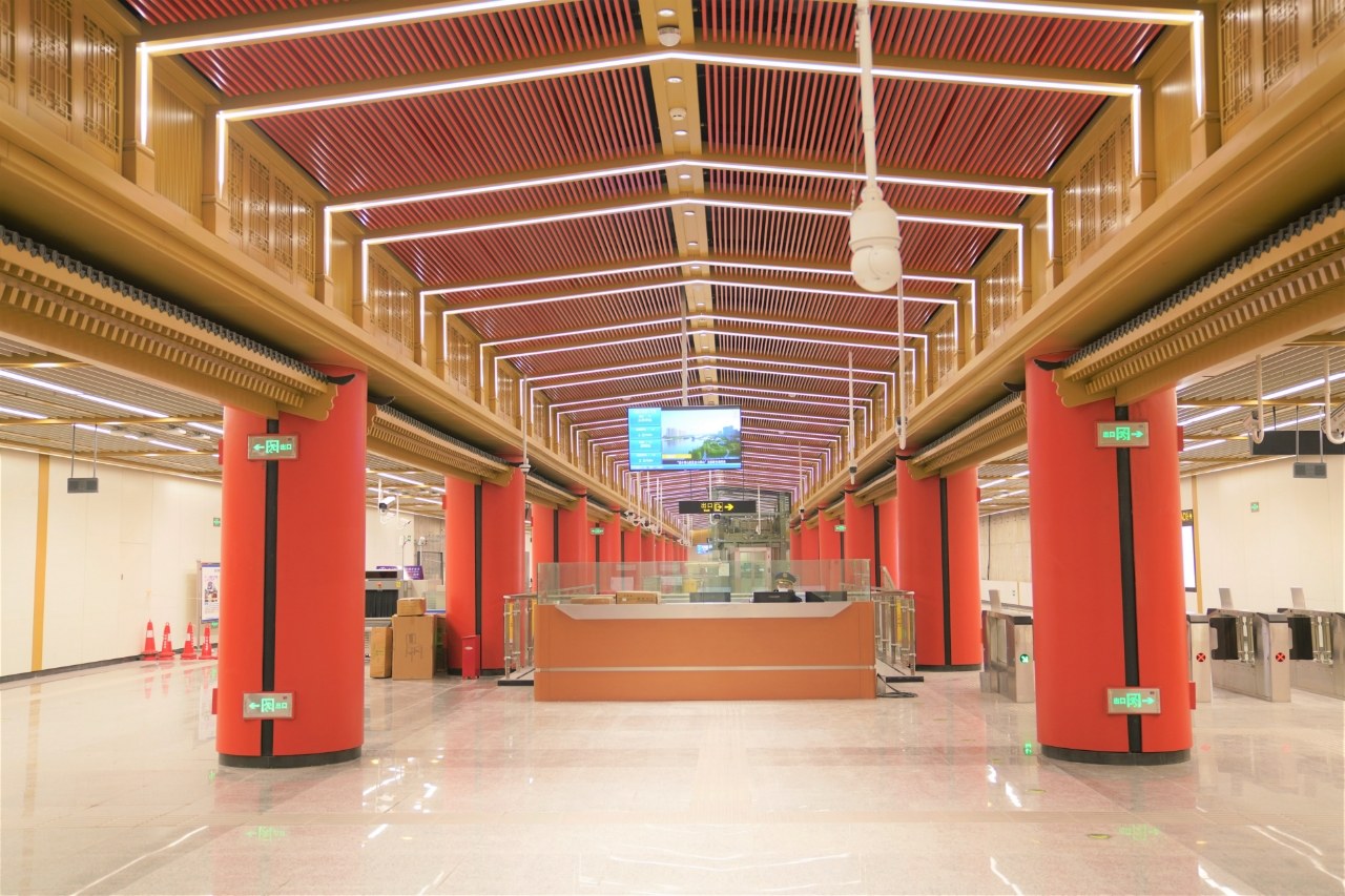 不止于此,太原地鐵2號線每一個站點,都隱藏著設(shè)計師的巧思妙想。北大街站天藍色的線條流暢得像條河,串著山西從古至今的故事,也串著山西與世界的相遇;府西街站的屋脊造型,是從山西古建中“搬”來的,翹角的弧度里藏著匠人的心思;晉陽街站的墻面印著晉商大院的磚雕,一磚一瓦都透著當年晉商走西口的豪邁;龍城大街站的屋檐,分明是五臺山延慶寺大殿的模樣,抬頭看時,仿佛能聽見古寺的鐘聲。