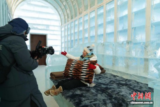 冰堡體驗(yàn)休息室布置了冰床、冰沙發(fā)等冰制陳設(shè),讓游客沉浸式體驗(yàn)冰雪住宿的新奇樂趣。 趙宇航 攝 在用雪打造的屋子里,羊肉片、凍豆腐、青菜拼盤等食材已經(jīng)擺好,陸續(xù)有游客前來體驗(yàn)雪屋火鍋的“冷熱交替”?!巴饷媪阆露?,吃著沸騰的火鍋很刺激?!北本┯慰蛣⒉┛≌f。
