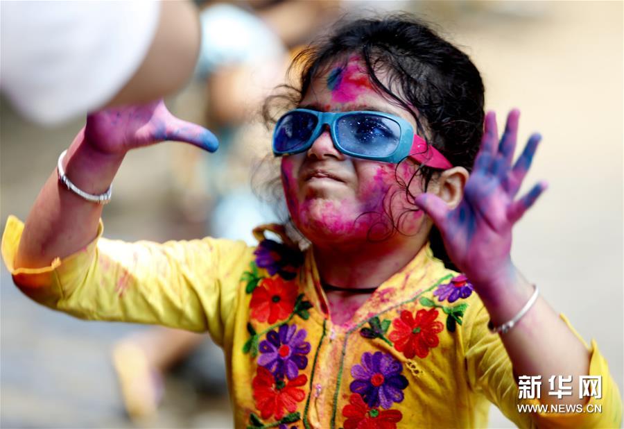 胡里節(jié)也叫“灑紅節(jié)”,人們?cè)谧约耗樕虾蜕砩贤可项伭?,還向別人拋撒五顏六色的顏料和粉末,迎接春天的到來。新華社發(fā)(吳昂 攝)