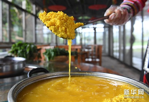 上五圖:4種不同植物及其色素染成的糯米和原色糯米;下左圖:4種不同植物色素染成的糯米和原色糯米;下右圖:在廣西上林縣巷賢鎮(zhèn),兩名壯族村民在查看一桶剛剛蒸熟的五色糯米飯(拼版圖片,3月25日攝)。 每年“壯族三月三”到來(lái)之際,廣西的壯族同胞都有蒸制五色糯米飯迎接節(jié)日的習(xí)俗,以祈禱五谷豐登,五福臨門。這些五色糯米飯,主要采用天然植物萃取色素,將糯米分別浸泡到紫、黃、紅、黑4種不同植物色素的水里,充分染色后,與原色糯米一起蒸熟而成。色澤鮮艷、清香誘人的五色糯米飯,是“壯族三月三”接待來(lái)客時(shí)必不可少的傳統(tǒng)美食。新華社記者 陸波岸 攝