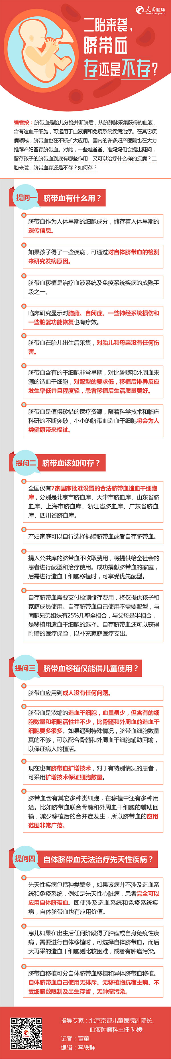 編者按:臍帶血是胎兒分娩并斷臍后,從臍靜脈采集獲得的血液,含有造血干細(xì)胞,可運(yùn)用于血液病和免疫系統(tǒng)疾病治療。在其它疾病領(lǐng)域,臍帶血也在不斷擴(kuò)大應(yīng)用。國內(nèi)的許多婦產(chǎn)醫(yī)院也在大力推薦產(chǎn)婦留存臍帶血。對(duì)此,一些準(zhǔn)爸爸、準(zhǔn)媽媽們會(huì)提出疑問,留存孩子的臍帶血到底有哪些作用,又可以治療什么樣的疾???二胎來襲,臍帶血存還是不存?如何存?