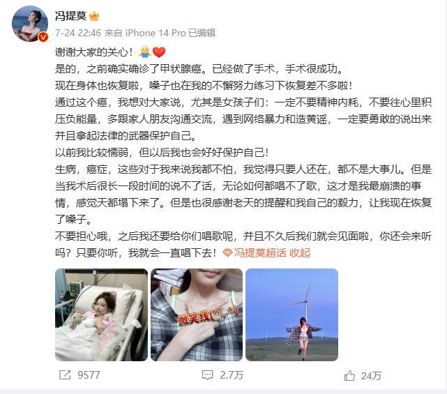 前不久,歌手馮提莫在微博發(fā)文稱自己患甲狀腺癌,經(jīng)手術(shù)已恢復(fù)。她說,通過這個癌,想對大家說,尤其是女孩子們,一定不要精神內(nèi)耗,不要往心里積壓負能量。