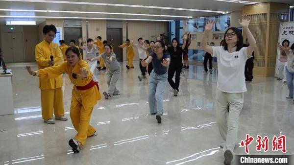 中新網(wǎng)杭州7月7日電 (張煜歡)“兩手向上、向前劃弧,隨即十指彎曲成虎爪,掌心向下……”近日,走進(jìn)浙江省立同德醫(yī)院一處古色古香的大廳內(nèi),數(shù)十位學(xué)員正跟著身著練功服的中醫(yī)專家認(rèn)真學(xué)習(xí)五禽戲。這是該醫(yī)院今年新開設(shè)的中醫(yī)養(yǎng)生夜校,通過(guò)傳授五禽戲、易筋經(jīng)、八段錦等中華養(yǎng)生導(dǎo)引術(shù),幫助市民有效鍛煉身體,達(dá)到祛病強(qiáng)身的效果。
