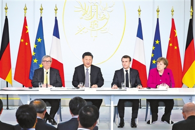 3月26日,國家主席習(xí)近平在巴黎同法國總統(tǒng)馬克龍一道出席中法全球治理論壇閉幕式。德國總理默克爾、歐盟委員會(huì)主席容克應(yīng)邀出席。