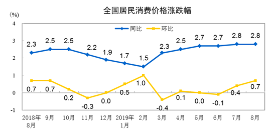 人民網(wǎng)北京9月10日電 (楊曦)國家統(tǒng)計(jì)局今日公布數(shù)據(jù)顯示,2019年8月份,全國居民消費(fèi)價格(CPI)同比上漲2.8%,與上月持平;8月份CPI環(huán)比上漲0.7%,漲幅略有擴(kuò)大。1——8月平均,CPI同比上漲2.4%。