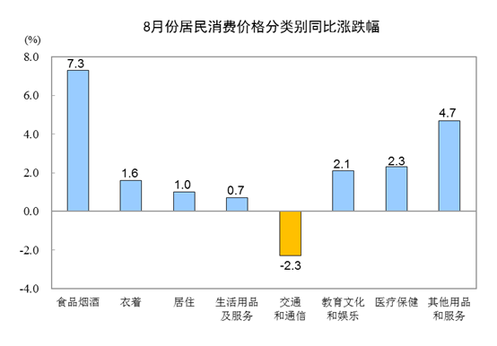 8月份,食品煙酒價格同比上漲7.3%,影響CPI(居民消費(fèi)價格指數(shù))上漲約2.14個百分點(diǎn)。其中,畜肉類價格上漲30.9%,影響CPI上漲約1.31個百分點(diǎn)(豬肉價格上漲46.7%,影響CPI上漲約1.08個百分點(diǎn));鮮果價格上漲24.0%,影響CPI上漲約0.39個百分點(diǎn);禽肉類價格上漲9.6%,影響CPI上漲約0.12個百分點(diǎn);雞蛋價格上漲3.8%,影響CPI上漲約0.02個百分點(diǎn);水產(chǎn)品價格上漲1.5%,影響CPI上漲約0.03個百分點(diǎn);糧食價格上漲0.7%,影響CPI上漲約0.01個百分點(diǎn);鮮菜價格下降0.8%,影響CPI下降約0.02個百分點(diǎn)。