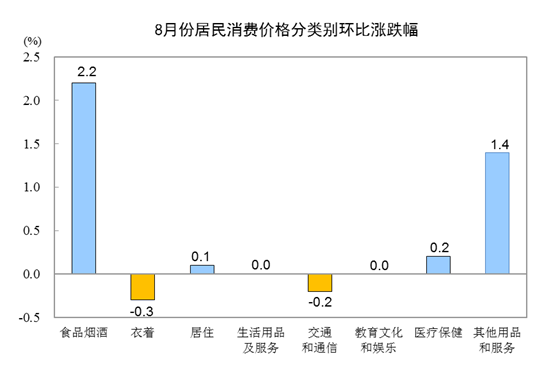 8月份,CPI環(huán)比上漲0.7%,漲幅比上月擴(kuò)大0.3個百分點(diǎn)。其中,城市上漲0.6%,農(nóng)村上漲1.0%;食品價格上漲3.2%,非食品價格上漲0.1%;消費(fèi)品價格上漲1.1%,服務(wù)價格上漲0.2%。