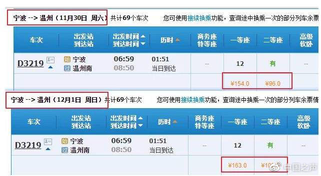 按照5.5折最低折扣,目前蘭州到西安的票價(jià)為174.5元,在最低價(jià)時(shí),或?qū)⒅恍?6元。然而,票價(jià)也并不是都處于降價(jià)趨勢(shì),對(duì)于部分列車段而言,票價(jià)也出現(xiàn)了上升的情況。以寧波開往溫州的G2343次列車為例,11月30日,該車的商務(wù)座288元,一等座154元,二等座96元;而12月1日,該車的票價(jià)商務(wù)座、一等座、二等座分別上漲17元、9元和6元,票價(jià)出現(xiàn)了小幅上漲。
