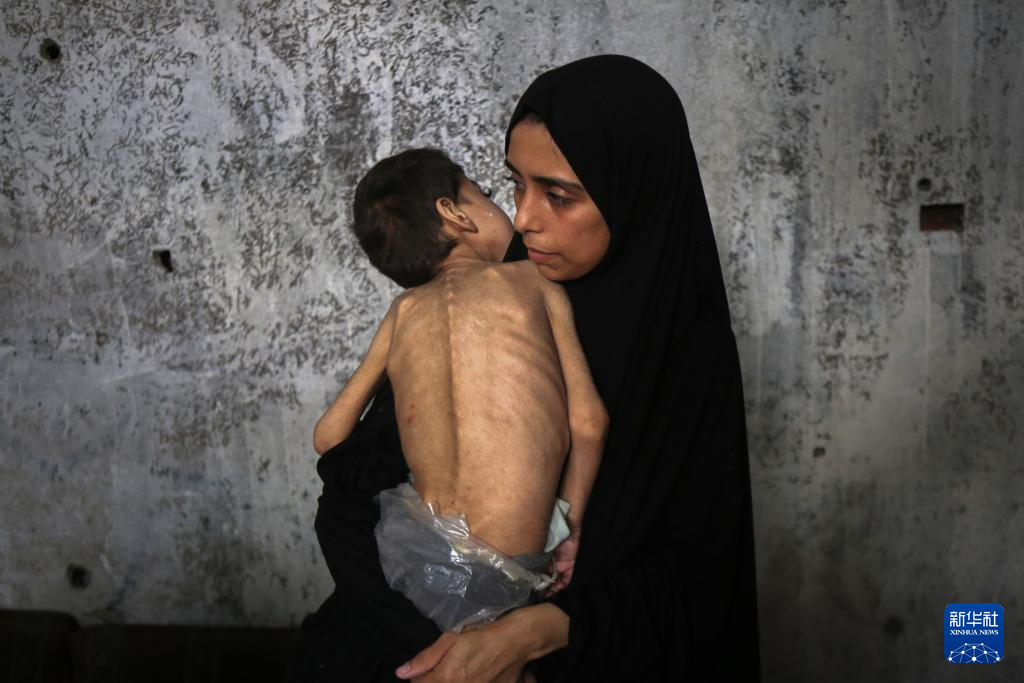 ??7月25日,在加沙城一處避難所,一名女子懷抱營養(yǎng)不良并患病的兒童。新華社發(fā)(里澤克·阿卜杜勒賈瓦德攝)