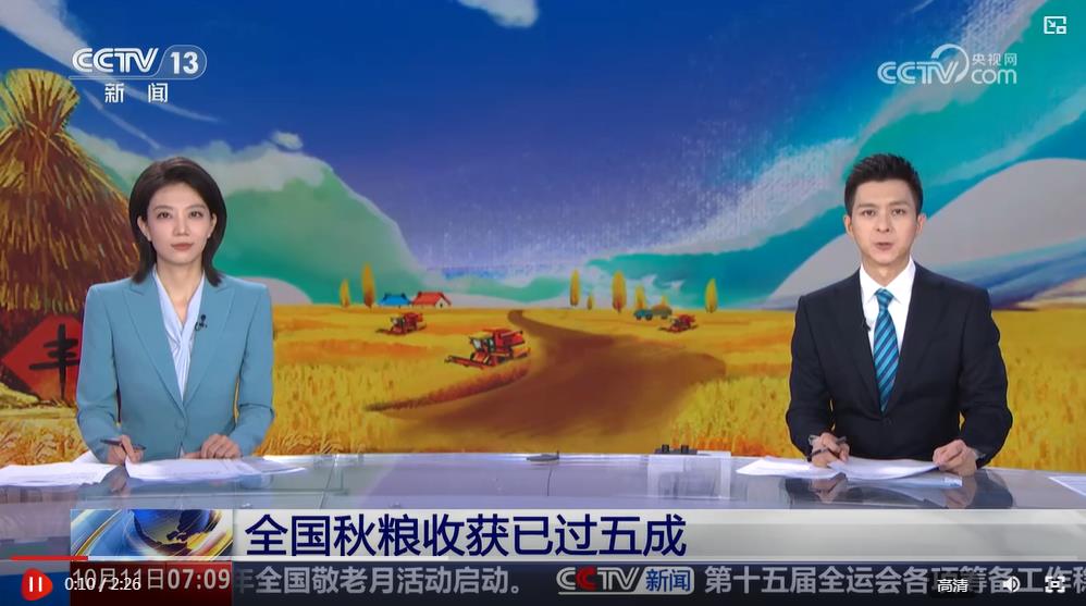 央視網(wǎng)消息:據(jù)農(nóng)業(yè)農(nóng)村部最新消息,截至10月10日,全國(guó)秋糧收獲已過五成。分作物看,中稻收獲近六成,玉米過五成,大豆五成半,雙季晚稻零星收獲。