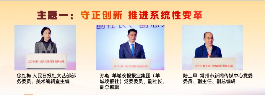 在“守正創(chuàng)新 推進系統(tǒng)性變革”主題研討環(huán)節(jié),人民日報社文藝部部務(wù)委員、美術(shù)編輯室主編徐紅梅,羊城晚報報業(yè)集團(羊城晚報社)黨委委員、副社長、副總編輯孫璇,常州市新聞傳媒中心黨委委員、副主任、副總編輯陸上早分別作主旨發(fā)言,介紹了各自領(lǐng)域推進系統(tǒng)性變革、發(fā)展新時代中國特色社會主義文化的實踐與探索。徐紅梅表示,“每日讀畫”采取“AI+美術(shù)”“微視頻+夜讀”的形式,堅持“讀準(zhǔn)、讀細(xì)、讀新、讀美”,讓AI成為深入畫境、開啟古今對話的共創(chuàng)者,以動態(tài)轉(zhuǎn)譯、意境擴展、流程再造、視聽融合開發(fā)美術(shù)融媒的敘事潛能,深入挖掘中華文明賡續(xù)傳承的基因密碼,成為探索主流媒體系統(tǒng)性變革的微觀樣本。孫璇表示,羊城晚報全面啟動系統(tǒng)性變革,以做強媒體、文化、數(shù)據(jù)、產(chǎn)業(yè)四個戰(zhàn)略板塊為重點,把“技術(shù)賦能”嵌入系統(tǒng)性變革各關(guān)鍵板塊,積極增強文化傳播、促進文化交流和繁榮文化生產(chǎn)。陸上早表示,常州借“蘇超”東風(fēng),走出城市轉(zhuǎn)型與能級躍升之路。改革的推進需聚焦六大方向:組織體系化,內(nèi)容精品化,傳播移動化,技術(shù)現(xiàn)代化,分配績效化,干部年輕化。