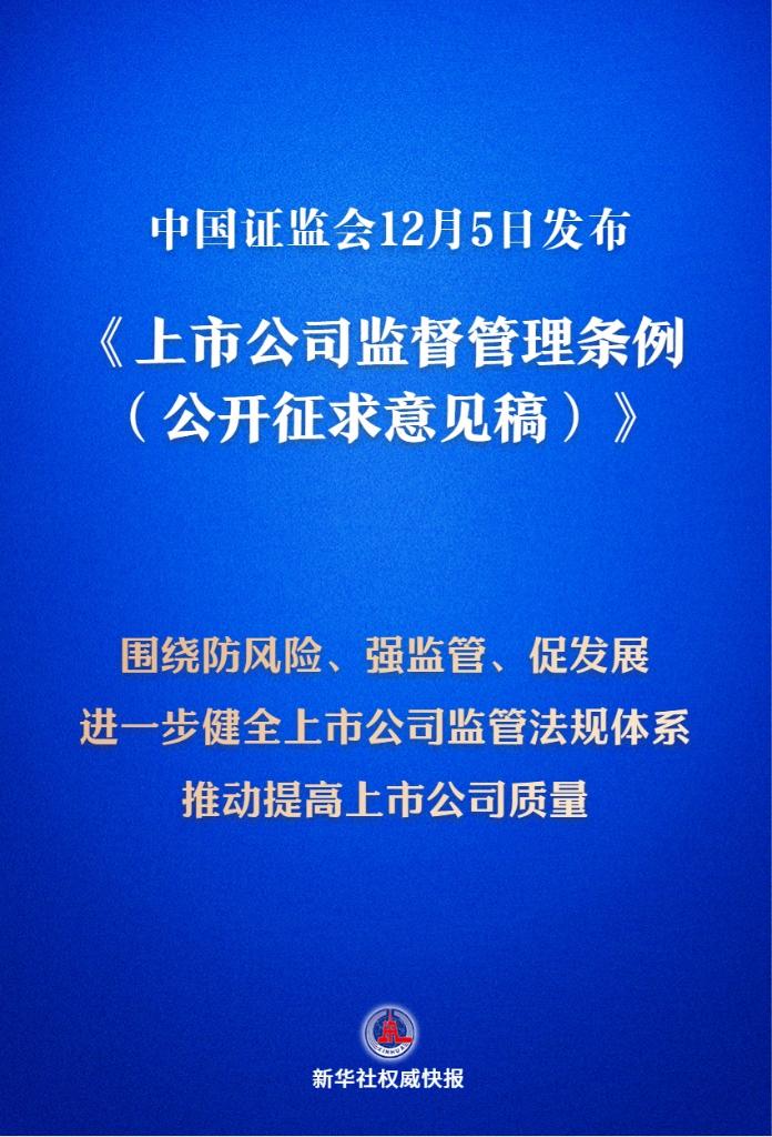 新華社北京12月5日電(記者劉羽佳)中國證監(jiān)會5日發(fā)布《上市公司監(jiān)督管理條例(公開征求意見稿)》,我國將迎來首部專門的上市公司監(jiān)管行政法規(guī)。 該條例是在公司法、證券法有關(guān)規(guī)定基礎(chǔ)上,對上市公司治理、信息披露等法律制度的進一步細化與明確。