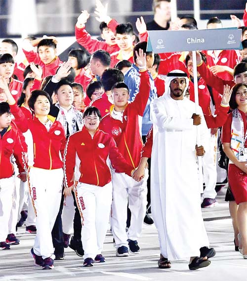 3 月14 日,李想(中)與自己的偶像、前奧運(yùn)冠軍李小鵬(前排右五)隨中國(guó)代表團(tuán)在2019 年阿布扎比夏季特奧會(huì)開(kāi)幕式上入場(chǎng)。