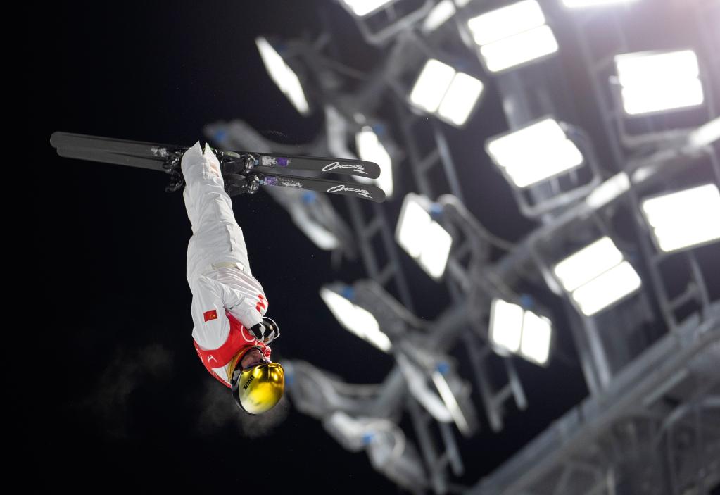 2月15日,中國選手齊廣璞在北京冬奧會自由式滑雪男子空中技巧資格賽中。新華社記者費茂華攝