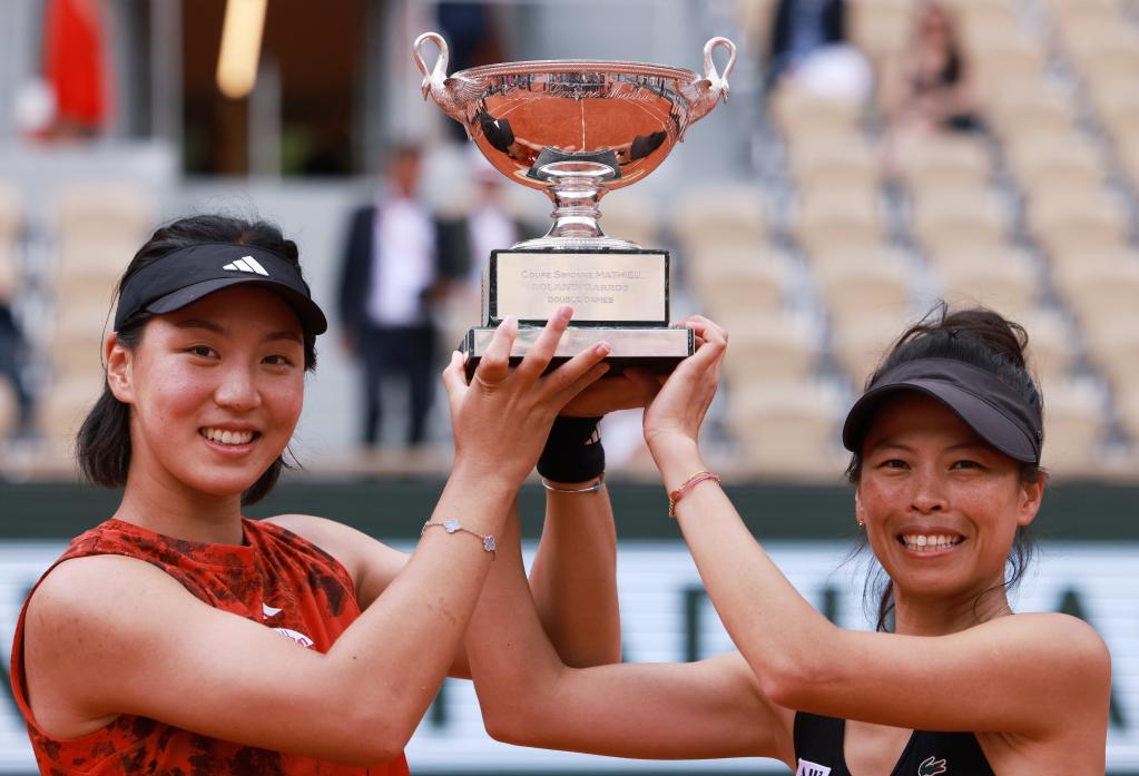 6月11日,王欣瑜(左)/謝淑薇捧起女雙冠軍獎杯。新華社記者 高靜 攝
