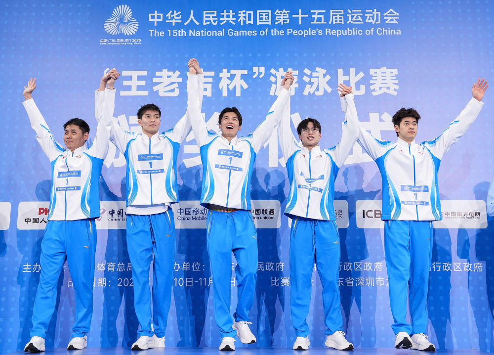 11月10日,冠軍浙江隊(duì)選手和教練在頒獎(jiǎng)儀式上。當(dāng)日,第十五屆全國(guó)運(yùn)動(dòng)會(huì)游泳項(xiàng)目男子4X100米自由泳接力決賽在深圳舉行。新華社記者 杜宇 攝