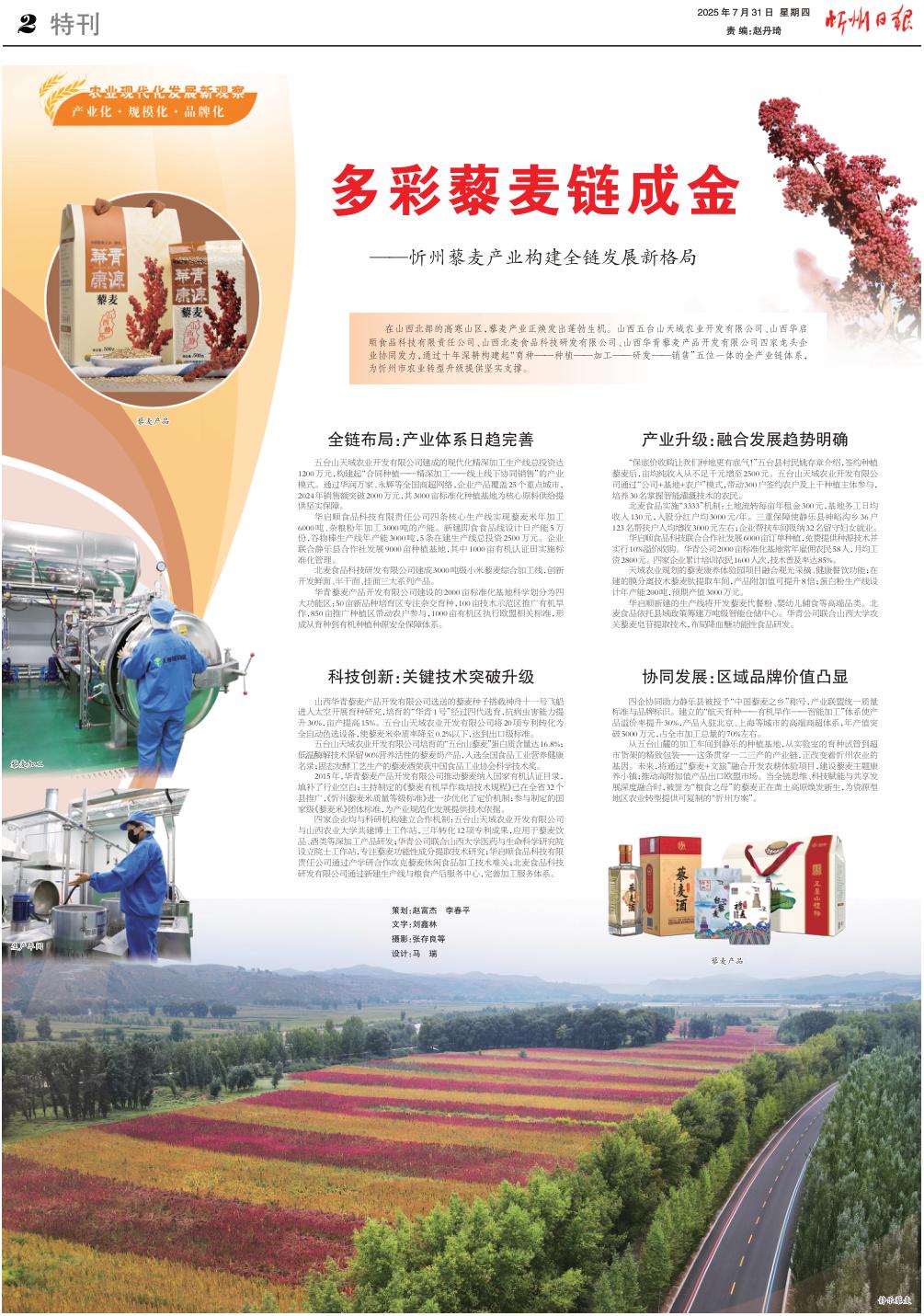 從五臺山麓的加工車間到靜樂的種植基地,從實(shí)驗(yàn)室的育種試管到超市貨架的精致包裝——這條貫穿一二三產(chǎn)的產(chǎn)業(yè)鏈,正改變著忻州農(nóng)業(yè)的基因。未來,將通過“藜麥+文旅”融合開發(fā)農(nóng)耕體驗(yàn)項(xiàng)目,建設(shè)藜麥主題康養(yǎng)小鎮(zhèn);推動(dòng)高附加值產(chǎn)品出口歐盟市場。當(dāng)全鏈思維、科技賦能與共享發(fā)展深度融合時(shí),被譽(yù)為“糧食之母”的藜麥正在黃土高原煥發(fā)新生,為資源型地區(qū)農(nóng)業(yè)轉(zhuǎn)型提供可復(fù)制的“忻州方案”。