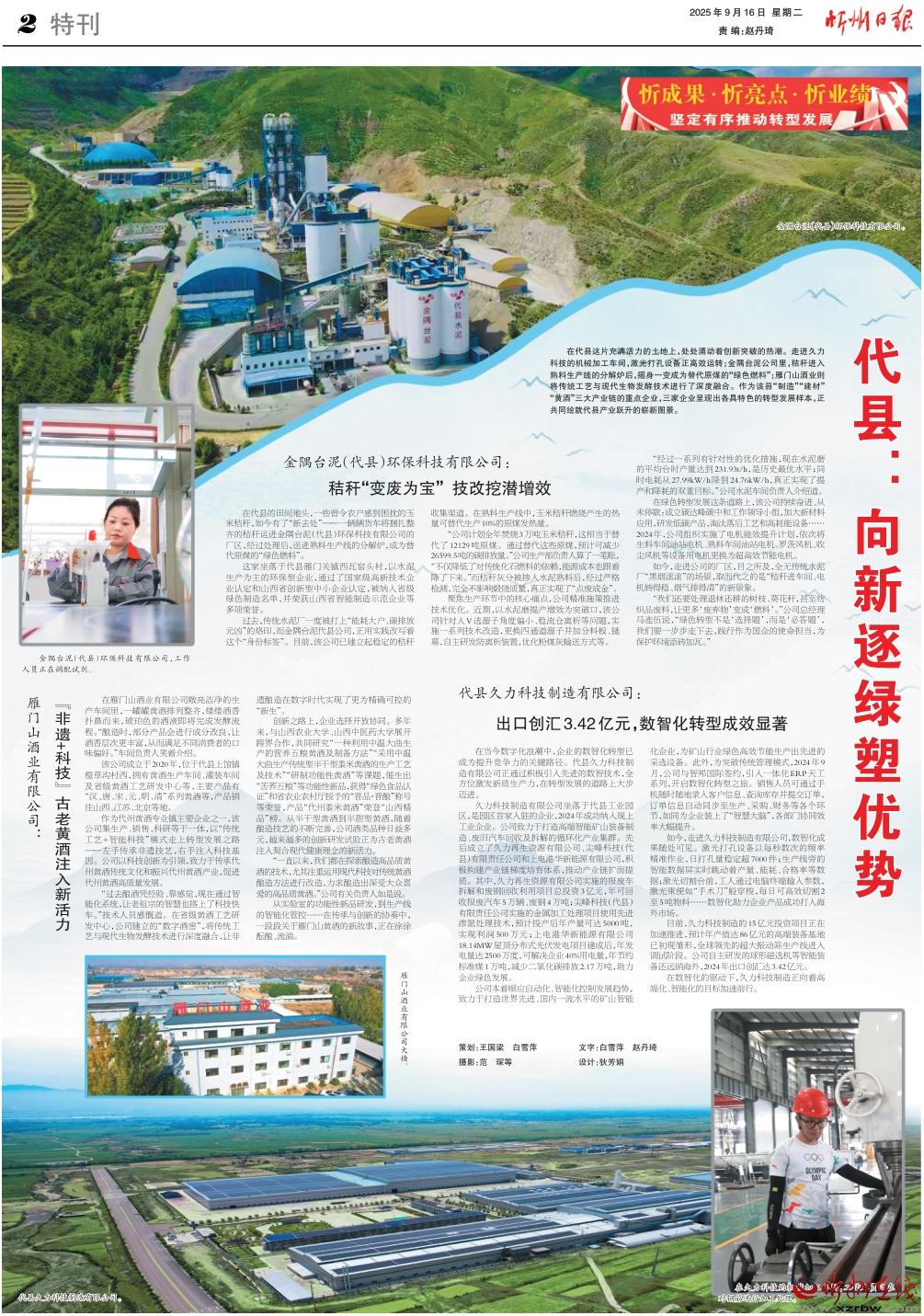 在代縣這片充滿活力的土地上,處處涌動(dòng)著創(chuàng)新突破的熱潮。走進(jìn)久力科技的機(jī)械加工車間,激光打孔設(shè)備正高效運(yùn)轉(zhuǎn);金隅臺(tái)泥公司里,秸稈進(jìn)入熟料生產(chǎn)線的分解爐后,搖身一變成為替代原煤的“綠色燃料”;雁門山酒業(yè)則將傳統(tǒng)工藝與現(xiàn)代生物發(fā)酵技術(shù)進(jìn)行了深度融合。作為該縣“制造”“建材”“黃酒”三大產(chǎn)業(yè)鏈的重點(diǎn)企業(yè),三家企業(yè)呈現(xiàn)出各具特色的轉(zhuǎn)型發(fā)展樣本,正共同繪就代縣產(chǎn)業(yè)躍升的嶄新圖景。