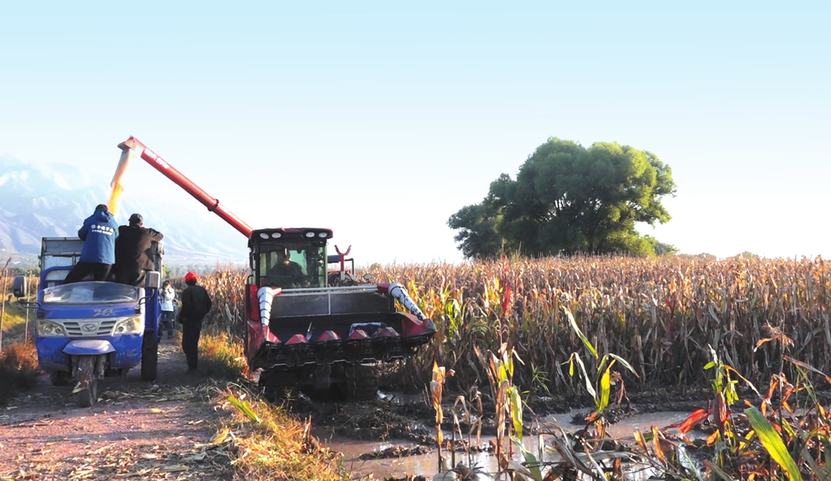 “突突”的引擎聲在濕漉漉的玉米地里轟鳴,來回穿梭中,金色的玉米在“吞吐”下脫粒,隨后如溪流般源源不斷地傾瀉而出,精準地落入一旁等候的運輸車廂內(nèi),瞬間堆起了一座座豐收的小山。
