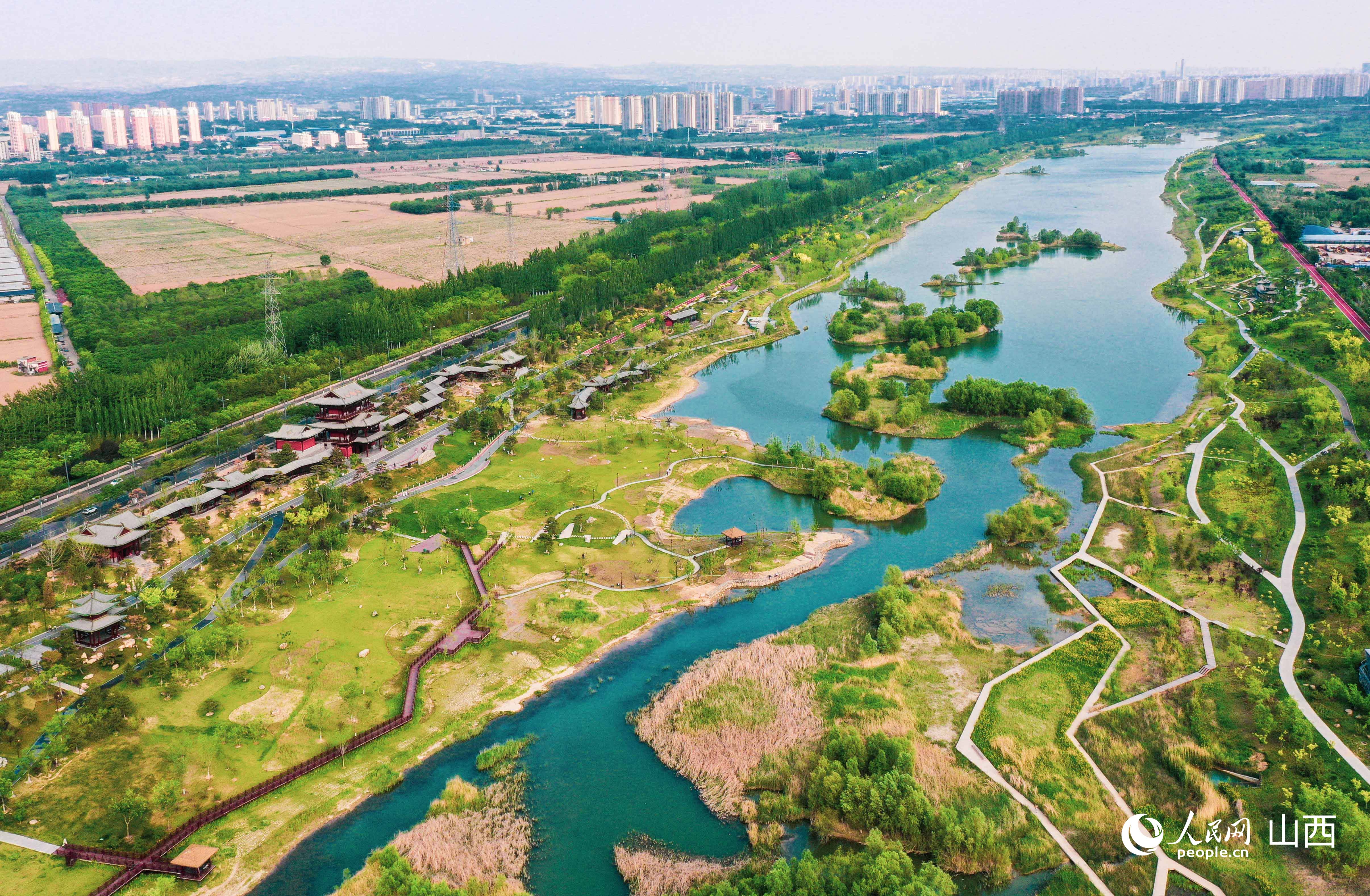 6月22日,俯瞰山西太原汾河四期濕地公園,雁丘園綠意盎然,水面波光粼粼,一派生機(jī)盎然,勾畫出一幅自然和諧的生態(tài)美景。