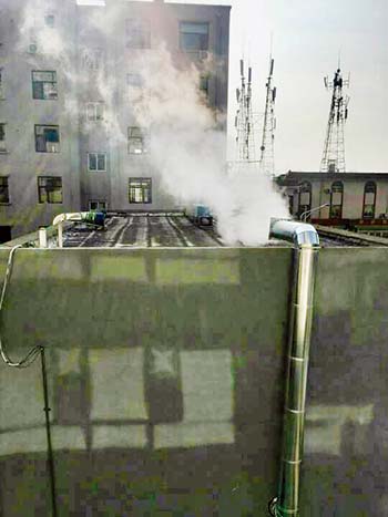 圖為城區(qū)榮鈺苑小區(qū)院內一飯店,四個排氣煙筒發(fā)出的噪音讓小區(qū)周邊居民無法正常休息,排放出的油煙散發(fā)出嗆人的味道,住戶沒法開窗戶,希望相關部門管理。一網友攝