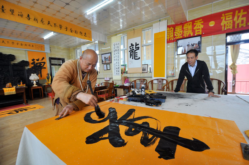 29日,中國(guó)佛教講經(jīng)交流會(huì)在五臺(tái)山召開(kāi)之際,記者走訪了東臺(tái)頂望海寺釋覺(jué)一法師,他在勤修佛法的同時(shí)在書畫藝術(shù)上也自成一家。他認(rèn)為,佛法與書畫關(guān)系密切相通之處,學(xué)習(xí)佛法可促進(jìn)書法境界的提升,有助于佛法的弘揚(yáng)。