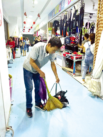 整個云河商場只有一層,共60多家商戶,衛(wèi)生清潔一天3次,工作量雖然不是很大,卻也不輕松。記者見到老馬時,他正在做商場關(guān)門前的最后一次清掃。不時有商戶喊老馬過去收紙箱和塑料袋,老馬加快了手里的動作?!吧虉鍪枪矆鏊芾硪餐栏竦?,我得隨時注意看哪里有了垃圾,或是公共設施出了問題,要不人來人往怕出事。干凈整潔的環(huán)境代表著商場的形象,也能讓顧客購物時有個好心情,這也是我工作的價值吧?!崩像R坦言,有的人衛(wèi)生習慣特別不好。商場里童裝生意最為火爆,有個別帶孩子的家長直接讓孩子隨地大小便,不僅弄臟了環(huán)境也作了不良示范。老馬希望通過創(chuàng)衛(wèi),大家愛護環(huán)境衛(wèi)生的意識得到提高,這樣他也可以輕松點了。(王菲)