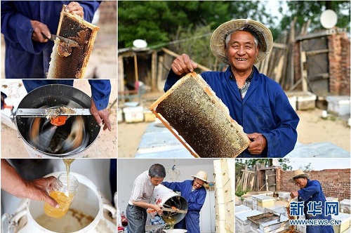 王巨才,男,1949年出生,山西省長治市武鄉(xiāng)縣鳳臺坪村人,2014年被列入建檔立卡貧困戶。2016年,在當(dāng)?shù)卣膸椭?,王巨才和兒子一起學(xué)習(xí)養(yǎng)蜂技術(shù),發(fā)展養(yǎng)蜂產(chǎn)業(yè)。2018年,王巨才銷售蜂蜜收入達(dá)到4萬多元。 右上:王巨才肖像;左上:王巨才在去除蜂板上的蜂蠟;左中:王巨才使用搖蜜機(jī)取蜜;左下:王巨才將蜂蜜裝到瓶子里;下中:王巨才(右)和兒子將搖蜜機(jī)里的蜜倒出;下右:王巨才在整理蜂箱(拼版照片,6月11日攝)。 地處晉東南的山西省長治市,位于由太行山、太岳山環(huán)繞而成的上黨盆地中。在群山中、崖壁上,許多村莊自然條件惡劣,基礎(chǔ)設(shè)施落后,脫貧致富是大山深處人們的迫切心愿。 近年來,一場場脫貧攻堅(jiān)戰(zhàn),在一個個深山村打響。政府全力探索脫貧路徑的同時,山區(qū)百姓因地制宜,靠自己的雙手和智慧走上致富路,交出了一份扎實(shí)的脫貧答卷。 記者在太行山、太岳山一路尋訪,記錄下多位70歲老人的生活。這些共和國的同齡人,親歷了山鄉(xiāng)的巨變,見證著長治山區(qū)脫貧攻堅(jiān)偉大工程的一步步推進(jìn)。 新華社記者 詹彥 攝