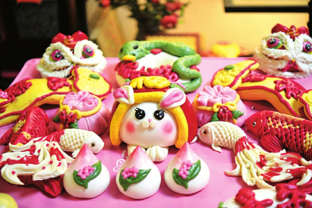 大肚福袋寓意福氣滿滿;醒獅賀歲,活靈活現(xiàn),送上吉祥如意;帶著梅花、中國結的寶葫蘆寓意福祿雙全……精選面粉純手工捏出的非遺花饃,有“饃”有樣,麥香十足,“蒸”出了咱老百姓新年的紅紅火火。