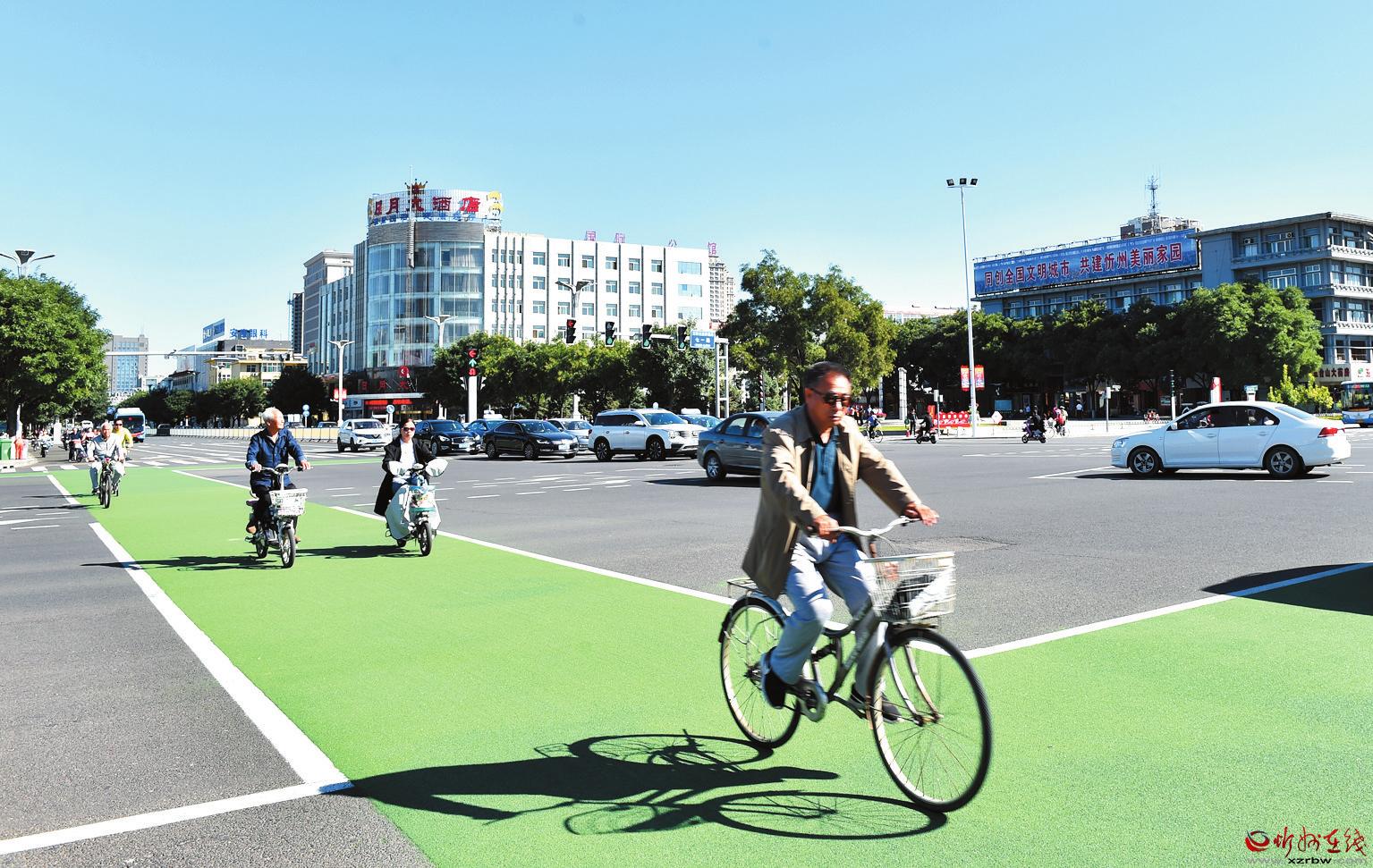 9月3日,市民在忻州城區(qū)七一路與長征街交叉路口的自行車專用道上騎行。日前,忻州路面上出現(xiàn)人車分離“斑馬線”,行人走斑馬線、騎行則走專用自行車道,很好地實現(xiàn)了人和非機(jī)動車分流通過,為創(chuàng)建文明城市增色。 宮清華 攝