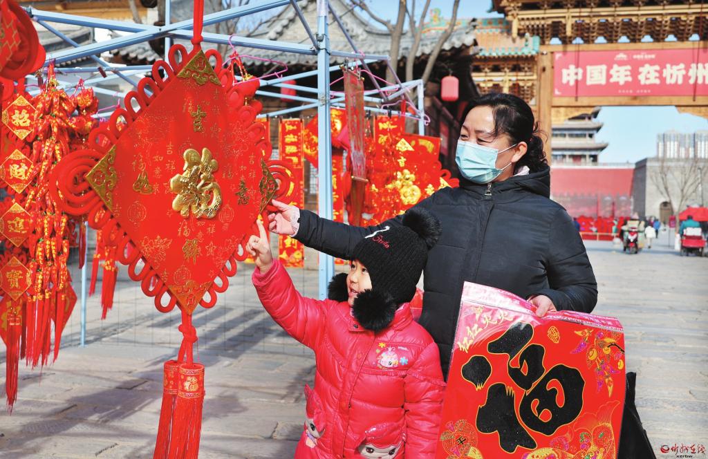 春節(jié)臨近,我市各大商場和年貨市場洋溢著濃濃的年味兒。春聯(lián)、“?!弊?、“中國結(jié)”等賀歲商品琳瑯滿目,到處都是紅紅火火的過年氣氛。右圖為2月3日,市民在忻州古城南北大街集市上選購年貨。 (張存良 攝)