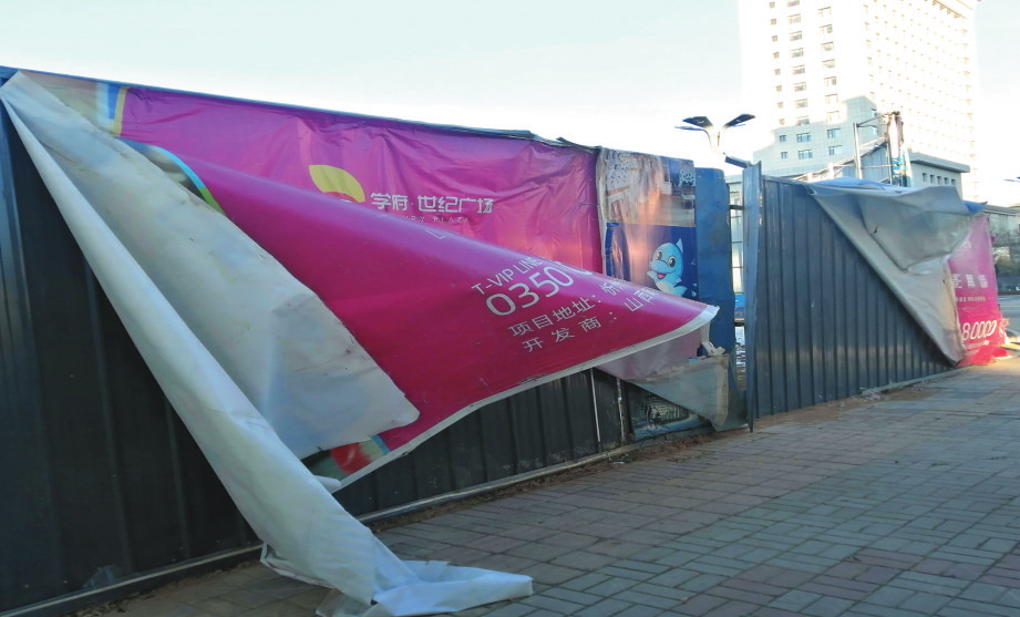 近日,受大風(fēng)影響我市城區(qū)幾處廣告牌被刮損,有的甚至有墜落危險(xiǎn),希望相關(guān)部門采取措施及時(shí)修復(fù),也提醒廣大市民如遇大風(fēng)天氣,應(yīng)盡量減少外出,出門時(shí)要盡量遠(yuǎn)離高層建筑物和廣告牌。(記者 李 濤 攝影報(bào)道