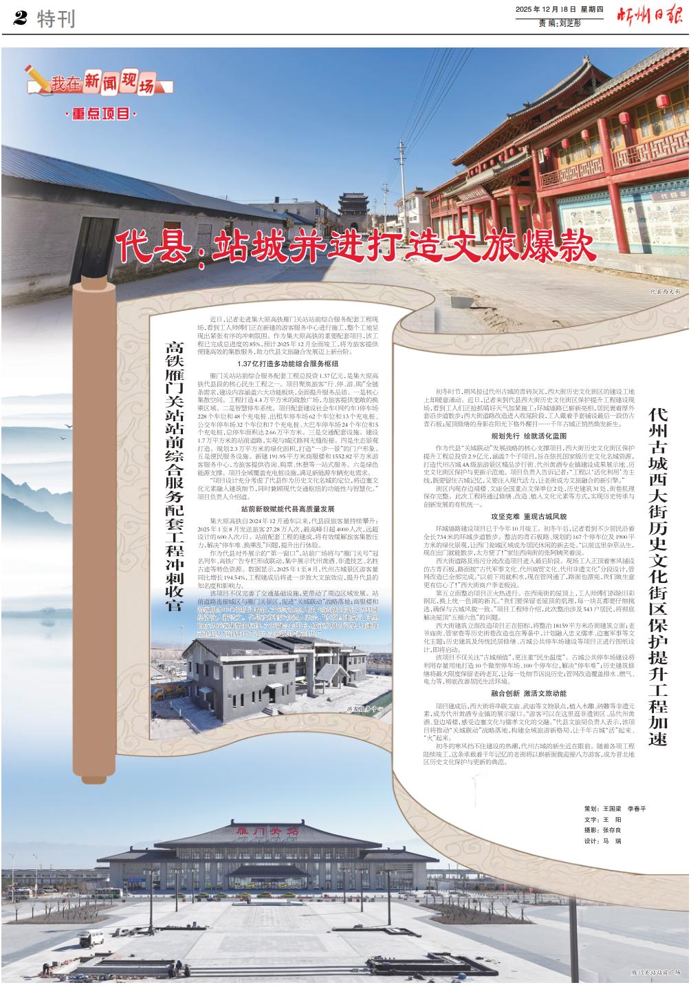 高鐵雁門關站站前綜合服務配套工程沖刺收官 近日,記者走進集大原高鐵雁門關站站前綜合服務配套工程現(xiàn)場,看到工人師傅們正在新建的游客服務中心進行施工,整個工地呈現(xiàn)出緊張有序的沖刺氛圍。作為集大原高鐵的重要配套項目,該工程已完成總進度的85%,預計2025年12月全面竣工,將為旅客提供便捷高效的集散服務,助力代縣文旅融合發(fā)展邁上新臺階。 1.37億打造多功能綜合服務樞紐 雁門關站站前綜合服務配套工程總投資1.37億元,是集大原高鐵代縣段的核心民生工程之一。項目聚焦旅客“行、停、游、購”全鏈條需求,建設內(nèi)容涵蓋六大功能板塊,全面提升服務品質(zhì)。一是核心集散空間。工程打造4.4萬平方米的疏散廣場,為旅客提供寬敞的換乘區(qū)域。二是智慧停車系統(tǒng)。項目配套建設社會車(網(wǎng)約車)停車場228個車位和48個充電樁、出租車停車場62個車位和13個充電樁、公交車停車場32個車位和7個充電樁、大巴車停車場24個車位和5個充電樁,總停車面積達2.66萬平方米。三是交通配套設施。建設1.7萬平方米的站前道路,實現(xiàn)與城區(qū)路網(wǎng)無縫銜接。四是生態(tài)景觀打造。規(guī)劃2.3萬平方米的綠化面積,打造“一步一景”的門戶形象。五是便民服務設施。新建191.95平方米商服樓和1552.82平方米游客服務中心,為旅客提供咨詢、購票、休憩等一站式服務。六是綠色能源支撐。項目全域覆蓋充電樁設施,滿足新能源車輛充電需求。 “項目設計充分考慮了代縣作為歷史文化名城的定位,將邊塞文化元素融入建筑細節(jié),同時兼顧現(xiàn)代交通樞紐的功能性與智慧化。”項目負責人介紹道。 站前新貌賦能代縣高質(zhì)量發(fā)展 集大原高鐵自2024年12月通車以來,代縣段旅客量持續(xù)攀升:2025年1至8月發(fā)送旅客27.28萬人次,最高峰日超4000人次,遠超設計的600人次/日。站前配套工程的建成,將有效緩解旅客集散壓力,解決“停車難、換乘亂”問題,提升出行體驗。 作為代縣對外展示的“第一窗口”,站前廣場將與“雁門關號”冠名列車、高鐵廣告專欄形成聯(lián)動,集中展示代州黃酒、非遺技藝、名勝古跡等特色資源。數(shù)據(jù)顯示,2025年1至8月,代州古城景區(qū)游客量同比增長194.54%,工程建成后將進一步放大文旅效應,提升代縣的知名度和影響力。 該項目不僅完善了交通基礎設施,更帶動了周邊區(qū)域發(fā)展。站前道路連接城區(qū)與雁門關景區(qū),促進“關城聯(lián)動”戰(zhàn)略落地;商服樓和游客服務中心將吸引餐飲、文創(chuàng)等業(yè)態(tài)入駐,創(chuàng)造就業(yè)崗位,為縣域經(jīng)濟注入新活力。代縣政府相關負責人表示:“該項目建成后,這里將成為旅客集散的樞紐、文旅融合的平臺、城市發(fā)展的引擎,加速推動我縣從‘高鐵時代’邁向‘文旅強縣’新時代?!?/p> 代州古城西大街歷史文化街區(qū)保護提升工程加速 初冬時節(jié),朔風掠過代州古城的青磚灰瓦,西大街歷史文化街區(qū)的建設工地上卻暖意涌動。近日,記者來到代縣西大街歷史文化街區(qū)保護提升工程建設現(xiàn)場,看到工人們正搶抓晴好天氣加緊施工:環(huán)城墻路已嶄新亮相,居民裹著厚外套沿步道散步;西大街道路改造進入收尾階段,工人戴著手套鋪設最后一段仿古青石板;屋頂修繕的身影在陽光下格外醒目……千年古城正悄然煥發(fā)新生。 規(guī)劃先行繪就活化藍圖 作為代縣“關城聯(lián)動”發(fā)展戰(zhàn)略的核心支撐項目,西大街歷史文化街區(qū)保護提升工程總投資2.9億元,涵蓋7個子項目,旨在依托國家級歷史文化名城資源,打造代州古城4A級旅游景區(qū)精品步行街、代州黃酒專業(yè)鎮(zhèn)建設成果展示地、歷史文化街區(qū)保護與更新示范地。項目負責人告訴記者:“工程以‘活化利用’為主線,既要留住古城記憶,又要注入現(xiàn)代活力,讓老街成為文旅融合的新引擎?!?/p> 街區(qū)內(nèi)現(xiàn)存邊靖樓、文廟全國重點文保單位2處,歷史建筑31處,街巷肌理保存完整。此次工程將通過修繕、改造、植入文化元素等方式,實現(xiàn)歷史傳承與創(chuàng)新發(fā)展的有機統(tǒng)一。 攻堅克難重現(xiàn)古城風貌 環(huán)城墻路建設項目已于今年10月竣工。初冬午后,記者看到不少居民沿著全長734米的環(huán)城步道散步。整潔的青石板路、規(guī)劃的167個停車位及1900平方米的綠化景觀,讓西門甕城區(qū)域成為居民休閑的新去處。“以前這里雜草叢生,現(xiàn)在出門就能散步,太方便了!”家住西南街的張阿姨笑著說。 西大街道路及雨污分流改造項目進入最后階段?,F(xiàn)場工人正頂著寒風鋪設仿古青石板,路面按“古代軍事文化、代州商貿(mào)文化、代州非遺文化”分段設計,管網(wǎng)改造已全部完成?!耙郧跋掠昃头e水,現(xiàn)在管網(wǎng)通了,路面也漂亮,我們做生意更有信心了!”西大街商戶李老板說。 第五立面整治項目正火熱進行。在西南街的屋頂上,工人師傅們拆除舊彩鋼瓦,換上統(tǒng)一色調(diào)的新瓦?!拔覀円A衾衔蓓?shù)募±?,每一塊瓦都要仔細挑選,確保與古城風貌一致?!表椖抗こ處熃榻B,此次整治涉及543戶居民,將徹底解決屋頂“五顏六色”的問題。 西大街建筑立面改造項目正在招標,將整治18159平方米沿街建筑立面;老爺廟街、管家巷等歷史街巷改造也在籌備中,計劃