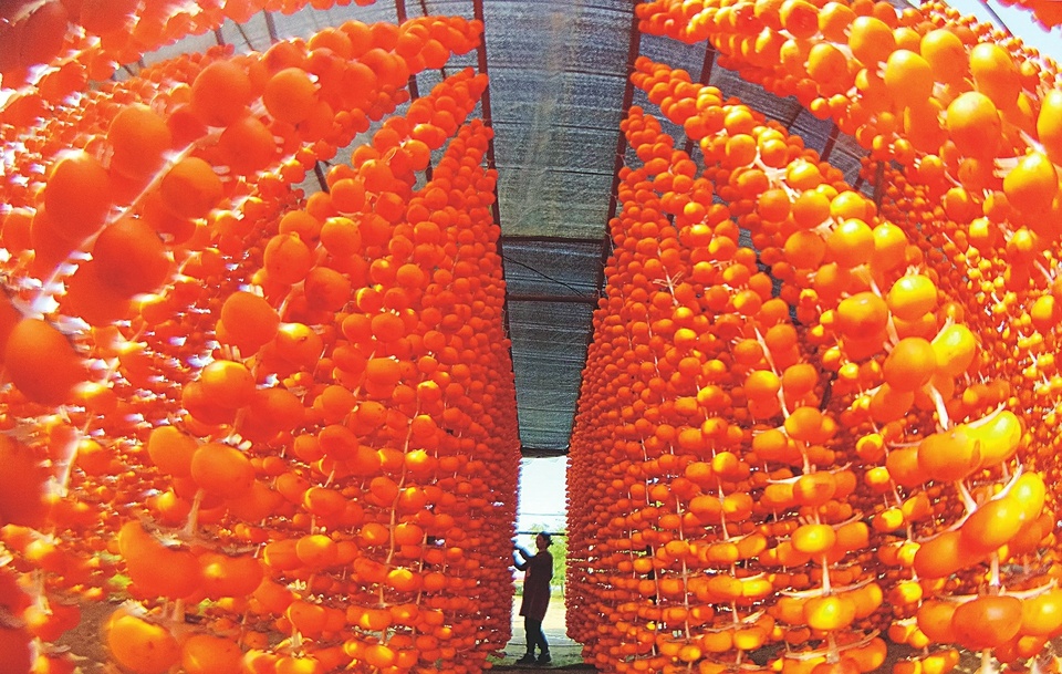 金秋時節(jié),山西省運城市新絳縣陽王鎮(zhèn)禪曲村的柿子迎來豐收,連片金黃的果實掛滿枝頭。在該村種植加工大戶許永安的“家庭微工廠”,柿農(nóng)們正忙著將柿子削皮加工、上架晾曬。
