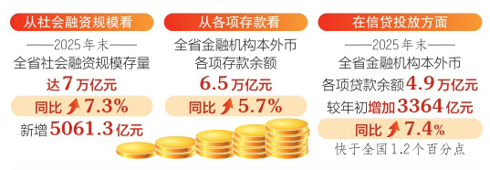 從社會融資規(guī)模看,2025年末,全省社會融資規(guī)模存量達(dá)7萬億元,同比增長7.3%;新增5061.3億元。其中,投向?qū)嶓w經(jīng)濟(jì)的本外幣貸款和政府債券凈融資增量合計占全部社融增量的94.4%。
