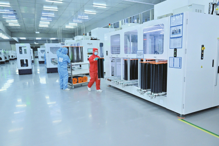 一道新能源科技(忻州)有限公司14GW光伏電池生產(chǎn)基地全自動化車間。