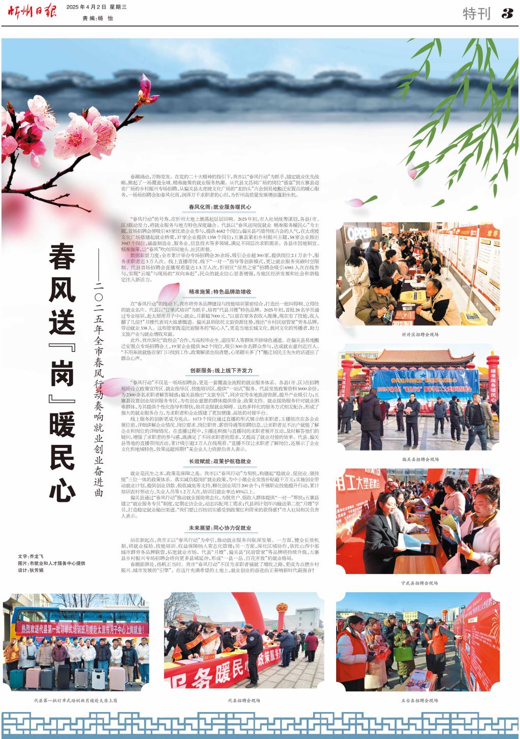 春潮涌動(dòng),萬(wàn)物競(jìng)發(fā)。在黨的二十大精神的指引下,我市以“春風(fēng)行動(dòng)”為抓手,錨定就業(yè)優(yōu)先戰(zhàn)略,掀起了一場(chǎng)覆蓋全域、精準(zhǔn)施策的就業(yè)服務(wù)熱潮。從代縣文昌祠廣場(chǎng)的崗位“盛宴”到五寨縣迎賓廣場(chǎng)的鄉(xiāng)村振興專場(chǎng)招聘,從偏關(guān)縣太虎坡文化廣場(chǎng)的“龍?zhí)ь^”古會(huì)到易地搬遷安置點(diǎn)的暖心服務(wù),一場(chǎng)場(chǎng)招聘會(huì)如春風(fēng)化雨,潤(rùn)澤萬(wàn)千求職者的心田,為忻州高質(zhì)量發(fā)展增添蓬勃生機(jī)。