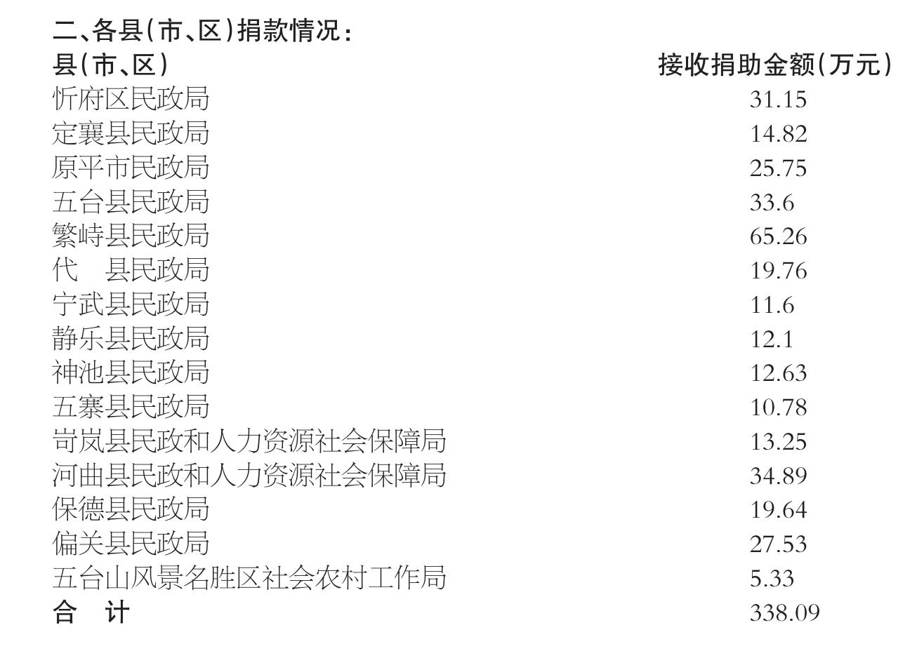 2024年11月22日,市委、市政府辦公室發(fā)出《關(guān)于開展“送溫暖、獻(xiàn)愛心”社會(huì)捐助活動(dòng)的通知》,市四大班子領(lǐng)導(dǎo)和機(jī)關(guān)干部率先垂范,各縣(市、區(qū))、各單位高度重視,認(rèn)真組織,廣大干部職工積極響應(yīng),“送溫暖、獻(xiàn)愛心”社會(huì)捐助活動(dòng)有效開展。截至2025年4月底,市直140個(gè)單位組織干部職工參與捐助,共捐款766388元,各縣(市、區(qū))接收捐款338.09萬元,合計(jì)捐款4147288元,為解決全市人民群眾的生產(chǎn)生活問題起到了積極作用?,F(xiàn)將捐助情況公告如下(市直單位以捐助時(shí)間先后為序):