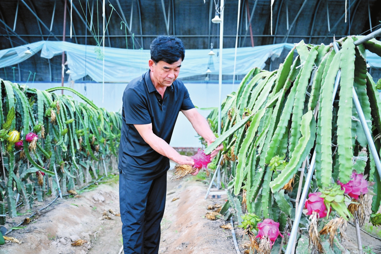鄔瑞華正在觀察火龍果長勢。本報(bào)記者馮曉磊攝