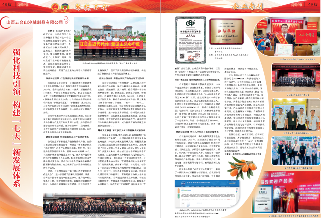 強(qiáng)化科技引領(lǐng) 構(gòu)建“七大”新發(fā)展體系 2025年,是國(guó)家“十四五”收官之年,也是山西五臺(tái)山沙棘制品有限公司上一個(gè)三年戰(zhàn)略規(guī)劃的收官之年。在復(fù)雜嚴(yán)峻的宏觀環(huán)境下,全體五臺(tái)山沙棘人同心聚力、迎難而上,緊緊圍繞沙棘產(chǎn)業(yè)化,強(qiáng)化戰(zhàn)略引領(lǐng),統(tǒng)籌推進(jìn)“七大體系”建設(shè),不僅實(shí)現(xiàn)了生產(chǎn)經(jīng)營(yíng)的穩(wěn)健發(fā)展,更在發(fā)展質(zhì)量上取得了實(shí)質(zhì)性突破,圓滿完成了階段性戰(zhàn)略任務(wù),實(shí)現(xiàn)了企業(yè)量的合理增長(zhǎng)與質(zhì)的有效提升。 強(qiáng)化科技引領(lǐng)打造研發(fā)與質(zhì)控雙輪驅(qū)動(dòng)體系 科技創(chuàng)新是企業(yè)的根,公司始終將科技創(chuàng)新置于發(fā)展全局的核心地位,持續(xù)完善研發(fā)與檢驗(yàn)體系。2025年,全年完成成品檢驗(yàn)177批次、原輔料驗(yàn)收110批次,產(chǎn)品合格率保持100%。 新品研發(fā)成果顯著:五峰慧果牌沙棘油軟膠囊順利完成延續(xù)注冊(cè);4款保健食品已完成小試;與山西省食品研究所聯(lián)合開發(fā)的“沙棘復(fù)合原漿”“沙棘清汁”成功上市;與山西中醫(yī)藥大學(xué)共同研發(fā)了沙棘本草精粹復(fù)合粉、沙棘本草復(fù)合膏及沙棘酒,進(jìn)一步延伸了大健康產(chǎn)品線。 公司積極通過學(xué)術(shù)交流吸收前沿理念,先后參加了第十屆國(guó)際沙棘協(xié)會(huì)大會(huì)、江南大學(xué)2025新型食品學(xué)科與產(chǎn)業(yè)交叉創(chuàng)新發(fā)展大會(huì)等,并與忻州師范學(xué)院開展校企對(duì)話,堅(jiān)持需求牽引、應(yīng)用驅(qū)動(dòng),全力打造沙棘產(chǎn)業(yè)科技創(chuàng)新與成果轉(zhuǎn)化高地,以科技競(jìng)爭(zhēng)力塑造企業(yè)發(fā)展新動(dòng)能。 聚焦主業(yè)強(qiáng)基構(gòu)建智能制造與產(chǎn)業(yè)協(xié)同體系 公司堅(jiān)定不移推進(jìn)生產(chǎn)裝備智能化升級(jí),堅(jiān)持自主研發(fā)關(guān)鍵技術(shù)及設(shè)備,構(gòu)建起了將每粒沙棘果“吃干榨盡”的全產(chǎn)業(yè)鏈循環(huán)體系。2025年,又引進(jìn)先進(jìn)智能前處理設(shè)備,新增4—15噸儲(chǔ)罐20個(gè),日處理沙棘果能力提升至100噸,在實(shí)現(xiàn)產(chǎn)能倍增的同時(shí)有效降低了人工依賴。配套建成的2500瓦智能化箱式變電站,依托5G云平臺(tái)實(shí)現(xiàn)供電系統(tǒng)故障預(yù)警與智能操控,有力保障了生產(chǎn)設(shè)備持續(xù)穩(wěn)定滿負(fù)荷運(yùn)行。 同時(shí),公司積極參加“第三屆山西省智能制造推進(jìn)大會(huì)”,進(jìn)一步明確了數(shù)字化轉(zhuǎn)型路徑。目前,公司生產(chǎn)設(shè)備智能化率已超過90%,生產(chǎn)效率較以往提升3倍,在實(shí)現(xiàn)降本增效、保障供應(yīng)鏈穩(wěn)定的同時(shí),為推動(dòng)沙棘精深加工在規(guī)模、效益與競(jìng)爭(zhēng)力上整體躍升,筑牢了高質(zhì)量發(fā)展的硬件根基,構(gòu)建起了智能制造與產(chǎn)業(yè)化的協(xié)同體系。 拓展價(jià)值空間完善全系列產(chǎn)品與全域營(yíng)銷體系 公司持續(xù)完善以“五峰慧果”品牌為核心的沙棘全系列產(chǎn)品矩陣,涵蓋沙棘系列保健食品、精制植物油、凝膠糖果、壓片糖果、藥食同源本草沙棘精粹復(fù)合粉、膏、沙棘原漿、沙棘復(fù)合原漿,沙棘清汁、沙棘酒等多元化品類。2025年,公司線上線下協(xié)同發(fā)力,推動(dòng)營(yíng)銷體系全面升級(jí):線上聚焦1688平臺(tái)OEM訂單攻堅(jiān),“雙十一”“雙十二”銷售額同比增長(zhǎng)60%;線下組織參加全國(guó)糖酒商品交易會(huì)、亞洲天然及營(yíng)養(yǎng)保健品展暨世界制藥原料中國(guó)展等,進(jìn)一步拓寬客源渠道。公司同步加強(qiáng)市場(chǎng)價(jià)格管控,依托溯源系統(tǒng)查處違規(guī)渠道、清理低價(jià)鏈接,有效維護(hù)品牌價(jià)值與市場(chǎng)秩序;基地游項(xiàng)目全年接待多批次游客,成為體驗(yàn)營(yíng)銷與品牌宣傳融合的重要窗口。 厚植文化根基深化多元文化與品牌融合賦能體系 文化是企業(yè)的魂,依托國(guó)家AAA級(jí)旅游景區(qū)“五峰慧果沙棘產(chǎn)業(yè)園”,公司將品牌建設(shè)提升至全局戰(zhàn)略高度,持續(xù)以文化賦能品牌發(fā)展,堅(jiān)持深度融合五臺(tái)山地域文化與沙棘健康文化屬性等,系統(tǒng)構(gòu)建“文化+旅游+工業(yè)+健康+沙棘+養(yǎng)生+中醫(yī)藥”多重文化業(yè)態(tài)。將地域文化與中醫(yī)養(yǎng)生理念有機(jī)融合,打造具有鮮明品牌特色的文化體驗(yàn)空間。特別是2025年,由五臺(tái)縣三晉文化研究會(huì)主辦、公司贊助并牽頭協(xié)辦首屆“五峰慧果杯靈山秀水萌五臺(tái)”短視頻大賽,獲得了一等獎(jiǎng),與此同時(shí),創(chuàng)作了一系列融合沙棘文化與地域風(fēng)情的視聽作品;結(jié)合二十四節(jié)氣、五行養(yǎng)生等傳統(tǒng)文化元素,持續(xù)優(yōu)化園區(qū)環(huán)境與體驗(yàn)設(shè)計(jì),有效增強(qiáng)了品牌文化內(nèi)涵與市場(chǎng)認(rèn)同感。 公司通過系統(tǒng)化品牌傳播,積極運(yùn)用媒體宣傳、專題報(bào)道與短視頻等形式,持續(xù)提升品牌影響力。年內(nèi)完成“五峰慧果”商標(biāo)續