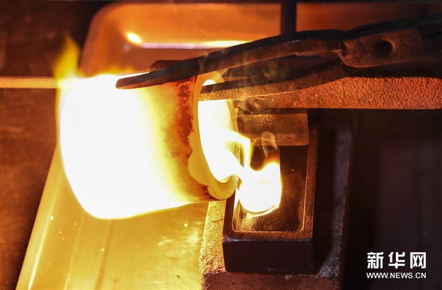在南京金線金箔總廠,工人將熔化的金水倒入容器(2019年12月12日攝)。68歲的王必生是江蘇南京人,1973年進入南京金箔鍛制技藝項目保護單位——南京金線金箔總廠,師從老藝人譚柱石,他虛心學習,潛心鉆研,很快掌握打金箔的技藝。他致力于技術革新和改造,參與機械打箔機、自動打箔機的研制。2009年他被評為國家級非物質文化遺產項目南京金箔鍛制技藝代表性傳承人。 金箔鍛制技藝,俗稱“打金箔”,歷史悠久。在南京一些地方,金箔生產仍然延用古代傳下的制作工序,鍛制過程包括化金條、拍葉、做捻子、沾捻子、打開子、裝開子、出具、切箔等。 金箔廣泛應用于建筑裝飾,還可應用于雕塑、工藝品、書畫、食品藥品、服飾等方面的貼金裝飾和制作。南京金箔品種有真金箔、銅箔、銀箔、鋁箔,薄如蟬翼、色澤純正、厚薄均勻,產品銷往海內外。 目前,王必生所在的南京金線金箔總廠是國家級非物質文化遺產代表性項目保護單位。工廠把人工打金箔的遺址保護起來,并成立了金箔大師工作室,加強金箔技藝的推廣,加大傳承人的培養(yǎng)力度。已經(jīng)退休的王必生被工廠返聘,負責打箔技藝展示和傳承。他說,現(xiàn)在機器打箔越來越多,但人工打出的金箔的更加柔軟,齊整。他希望這一傳統(tǒng)技藝能夠繼續(xù)傳承下去。新華社記者 楊磊 攝