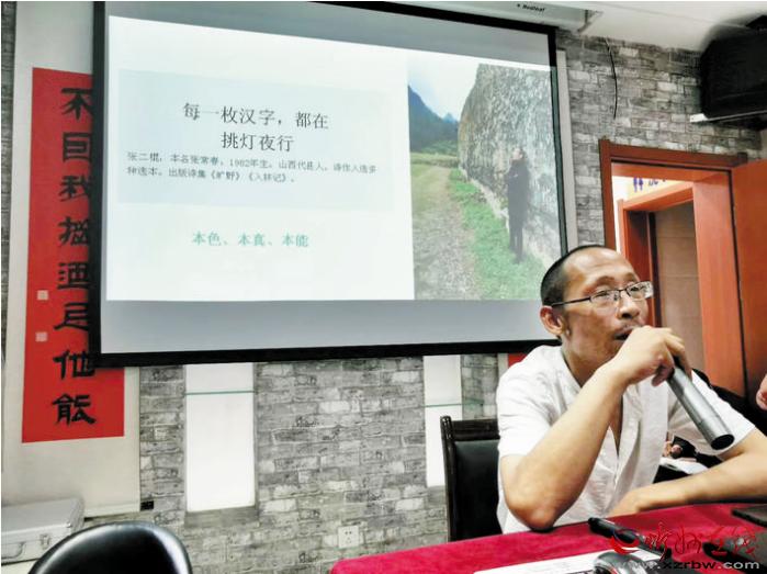 本報(bào)訊 8月15日晚,位于忻州市七一北路的好目匠眼鏡店迎來(lái)一場(chǎng)文學(xué)盛會(huì)。保德縣、岢嵐縣、五寨縣、原平市、定襄縣的詩(shī)歌愛好者,與忻州城區(qū)的詩(shī)歌愛好者一起聆聽了著名詩(shī)人張二棍關(guān)于詩(shī)歌創(chuàng)作的講座,甚至有詩(shī)歌愛好者專門從北京趕回忻州。當(dāng)晚,連講座廳外都站滿了聆聽的人。