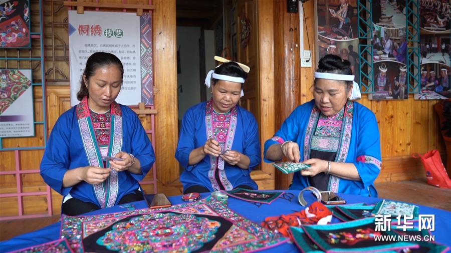 楊甜介紹,近年來,同樂鄉(xiāng)大力推動侗繡技藝傳承,采取“公司+基地+農(nóng)戶(貧困戶)”運行模式,組織技藝傳承人將侗繡技藝傳授給當?shù)貗D女,帶動當?shù)厝罕?00多戶參與刺繡,其中貧困戶50多戶,侗繡作品被銷往國內(nèi)外,實現(xiàn)了助農(nóng)增收。