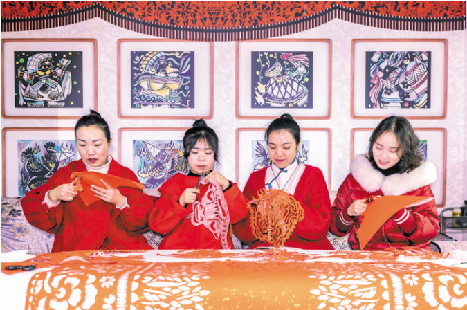 1月17日,岳紅霞(右二)帶領(lǐng)工作室學(xué)員創(chuàng)作“金牛送?!奔艏?。近日,曾獲全國剪紙大賽“金剪刀獎”、貴州省畢節(jié)市黔西縣非遺傳承人岳紅霞帶領(lǐng)工作室學(xué)員創(chuàng)作“金牛送福”系列主題作品,迎接農(nóng)歷牛年。 (新華社發(fā) 范暉 攝)