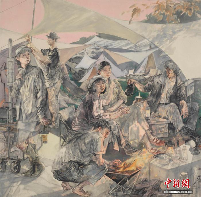 以畫家藺潔青的中國畫《清風(fēng)徐來》為例,其是浙江省第十五屆美術(shù)作品展金獎作品,以傳統(tǒng)人物畫技法表現(xiàn)當(dāng)代青年郊野露營場景,通過描繪清風(fēng)拂過林間被永恒定格的瞬間,傳遞都市人向往自然、追求心靈自由的當(dāng)代精神,展現(xiàn)出中國傳統(tǒng)繪畫語言在表現(xiàn)現(xiàn)實題材上的蓬勃生命力。