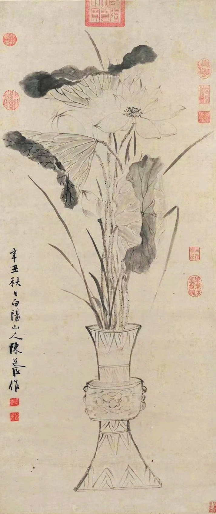 陳淳的《瓶荷寫生圖》中,一青銅花觚內(nèi)插數(shù)枝荷花,細葉菖蒲點綴其間。向上伸展的枝葉幾乎占滿畫面,盡顯夏日花草的勁挺之氣與蓬勃生機。此作給人最大的視覺感受是不拘一格的瀟灑筆觸與靈動造型,尤其靠下方的兩片荷葉,以及右側彎折垂下的一片細葉,甚至顯現(xiàn)出一絲不加修飾的潦草、頹敗之感,而恰是對此等細節(jié)的保留,生動體現(xiàn)出植物自然的生長姿態(tài)。