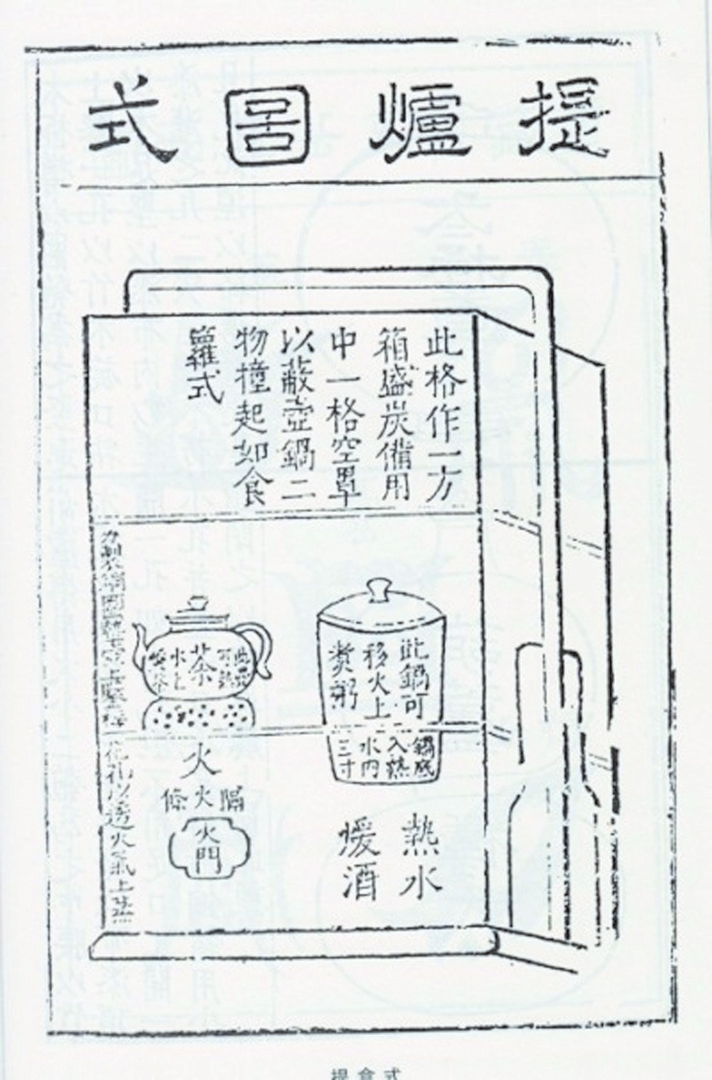 根據(jù)文字與插圖可以看出,提爐的靈感來(lái)自當(dāng)時(shí)普遍使用的“三撞”,即三層式提盒,由可以靈活組裝或分卸的幾部分組成,包括一個(gè)帶有底座的提梁架、兩層方屜盒、一個(gè)四方形圍框,以及一只銅質(zhì)四方形的水火爐。兩層屜盒與四方形圍框在外徑上尺寸一致,且彼此采用子母口套合,可以按照一層屜盒在下、四方形圍框在中、一層屜盒在上的形式疊置,并依靠子母口嵌合牢固。下層方屜盒的外徑尺寸要與提梁架底座上的淺凹槽正好相當(dāng),這樣在移動(dòng)過(guò)程中,屜盒就能牢固嵌置在底座的凹槽內(nèi),不會(huì)脫落。整套配置中最重要的組件是一只小銅火爐,這只銅爐亦為四方形,外徑與下層屜盒的內(nèi)徑相當(dāng),可以恰好放置在屜內(nèi),不會(huì)晃動(dòng)。此爐之所以名為“水火爐”,是因?yàn)闋t體的內(nèi)部用銅板隔為左右兩個(gè)用途不同的區(qū)域,分別發(fā)揮煮水風(fēng)爐與燙酒器的功能。左半部的頂面安有圓形灶,可以放入火炭,在其側(cè)壁上則開(kāi)有火門(mén),用以通風(fēng)、清灰,因此只要將特制的茶壺置于灶上,就可以隨時(shí)生火煮水,沖茶品茗;右半部則僅在頂面開(kāi)有一個(gè)圓口,使用的時(shí)候通過(guò)圓口向內(nèi)注入熱水,然后把一只與圓口大小相配的帶蓋小桶放入其中,再把酒注入小桶,將酒燙熱。小桶是為了組合方便精心設(shè)計(jì)的,還可以擔(dān)任袖珍煮鍋的角色,故《遵生八箋》中稱其為“小鑊”。游玩中肚子餓時(shí),還可以隨時(shí)把這只小桶放到灶口上,煮粥或者其他便于快速制作的飲食,就地來(lái)一頓野餐。